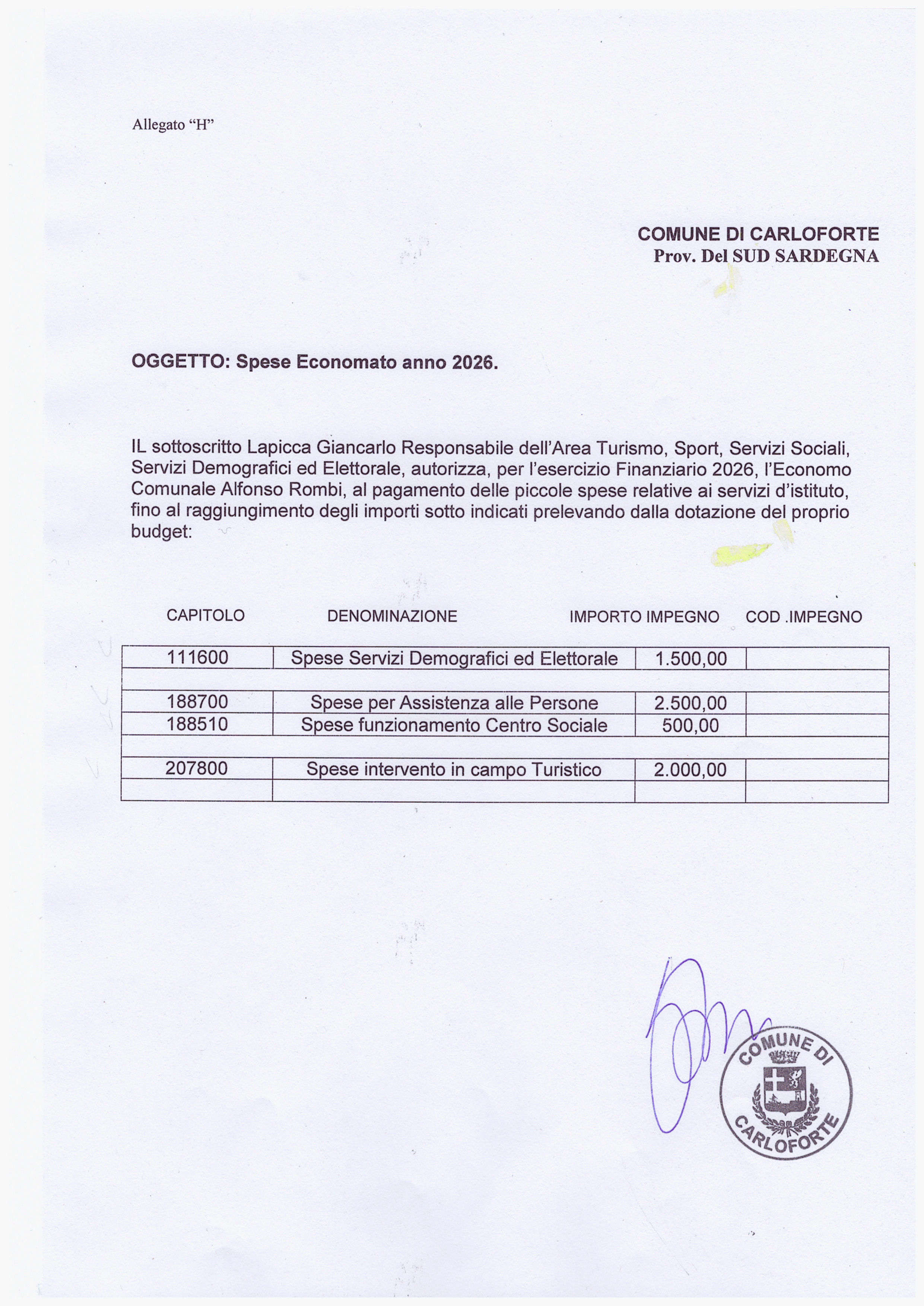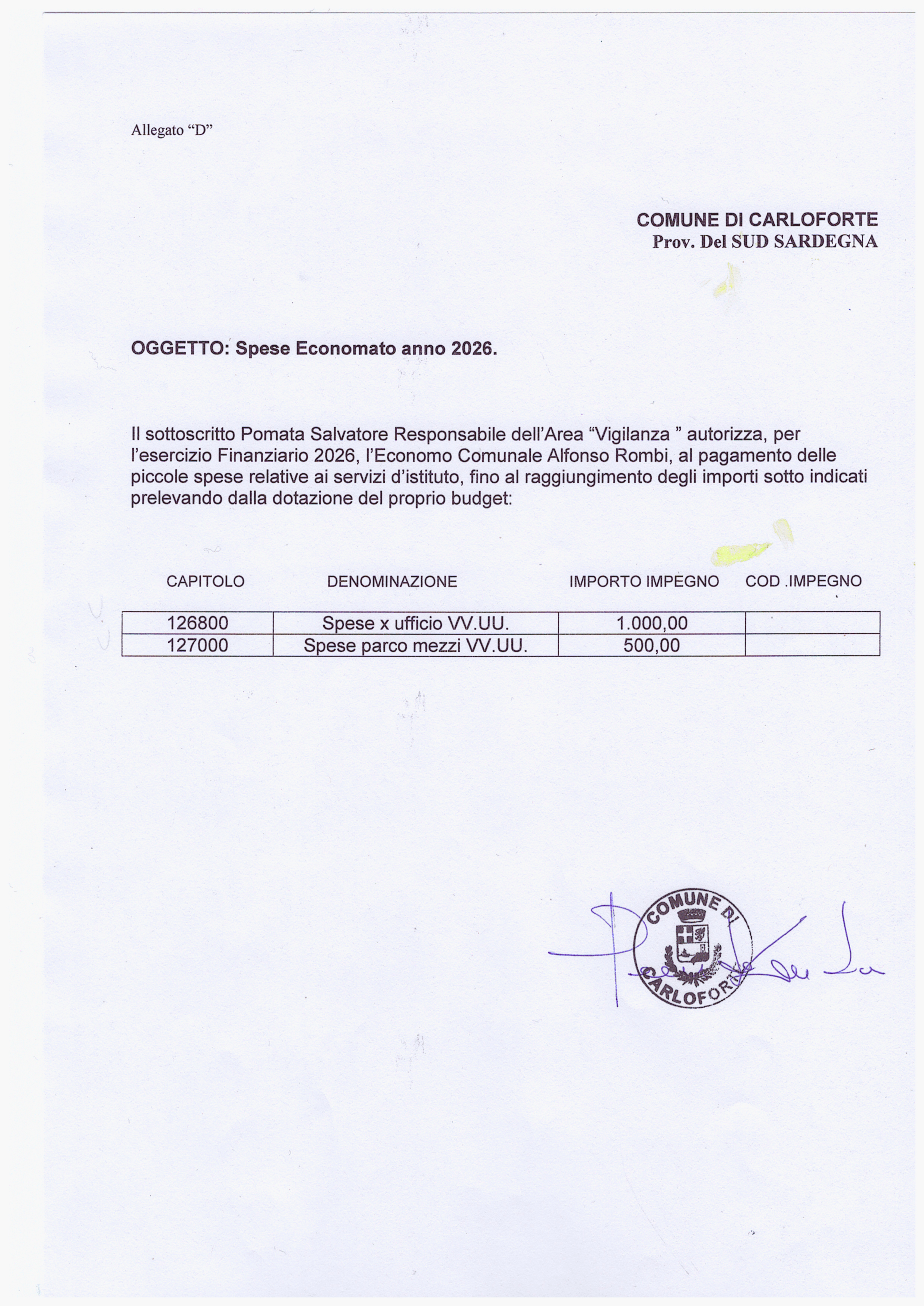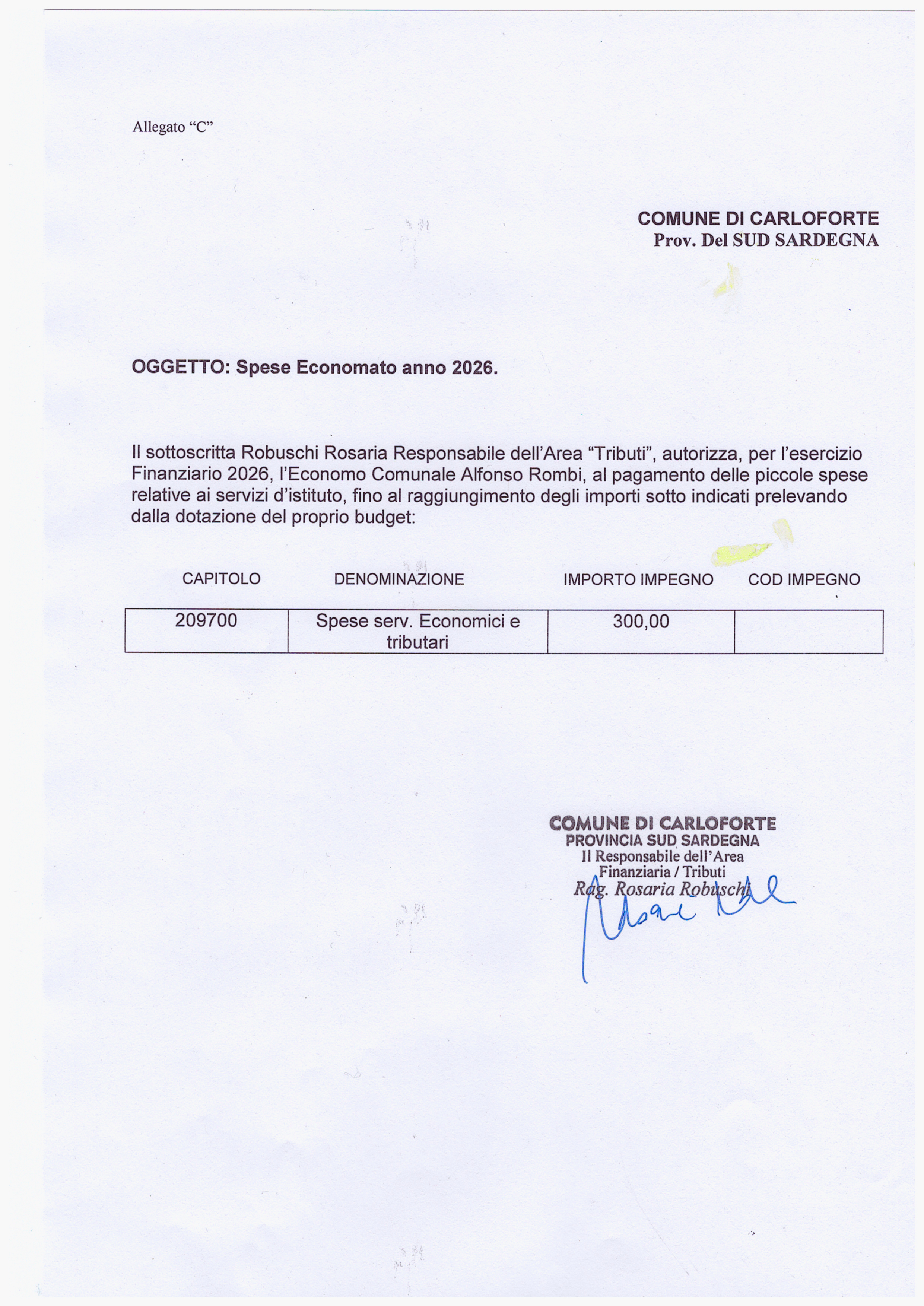 Oggetto: IMPEGNI SPESE ECONOMATO ANNO 2026