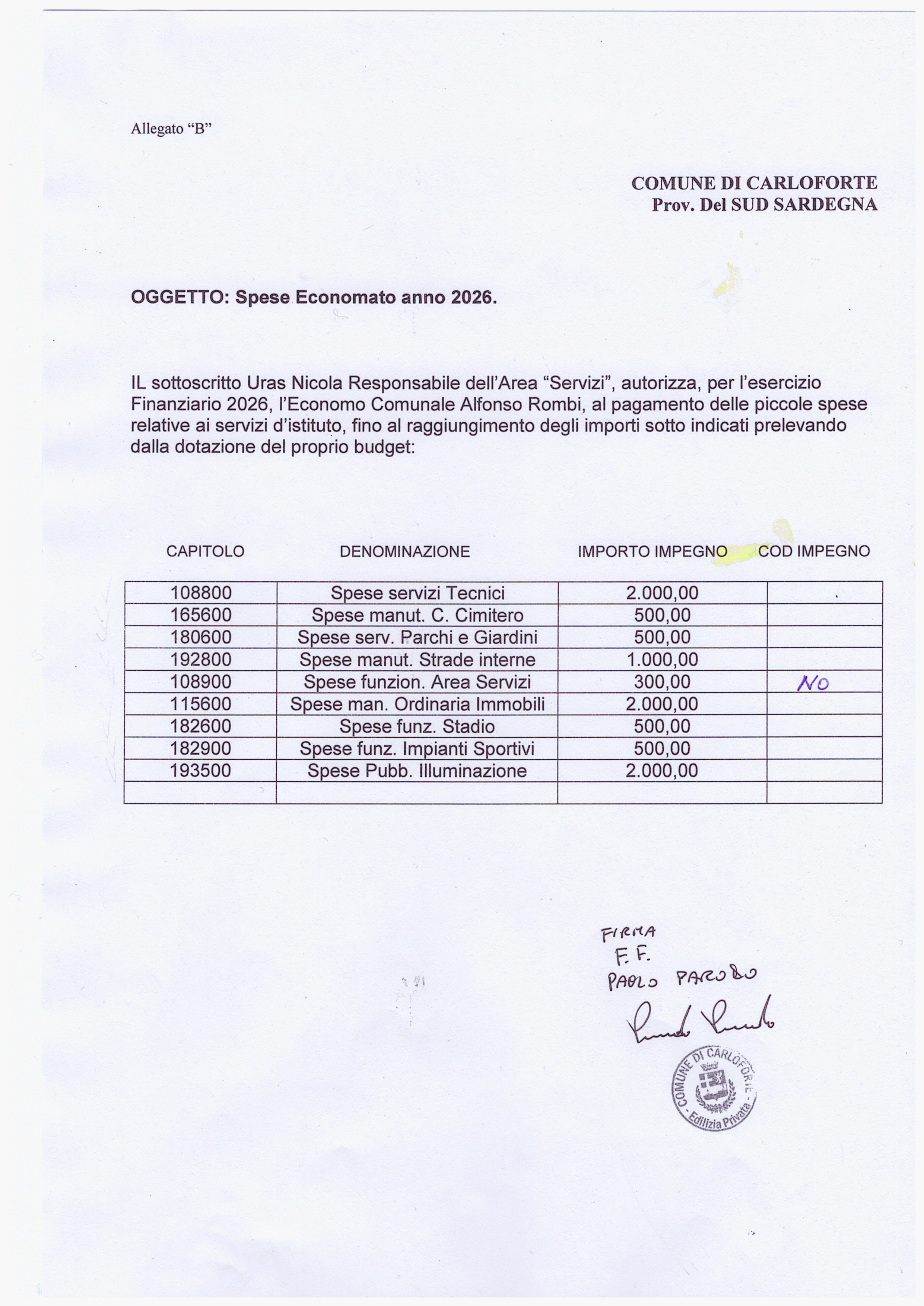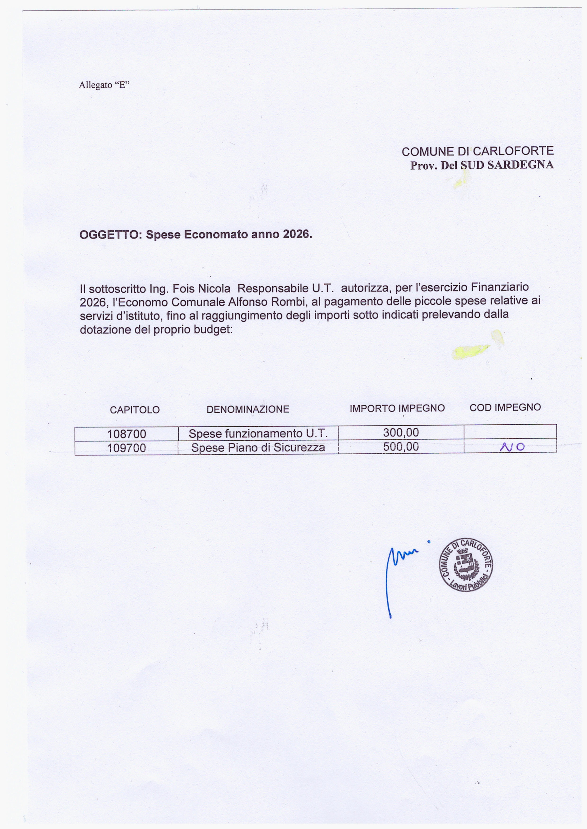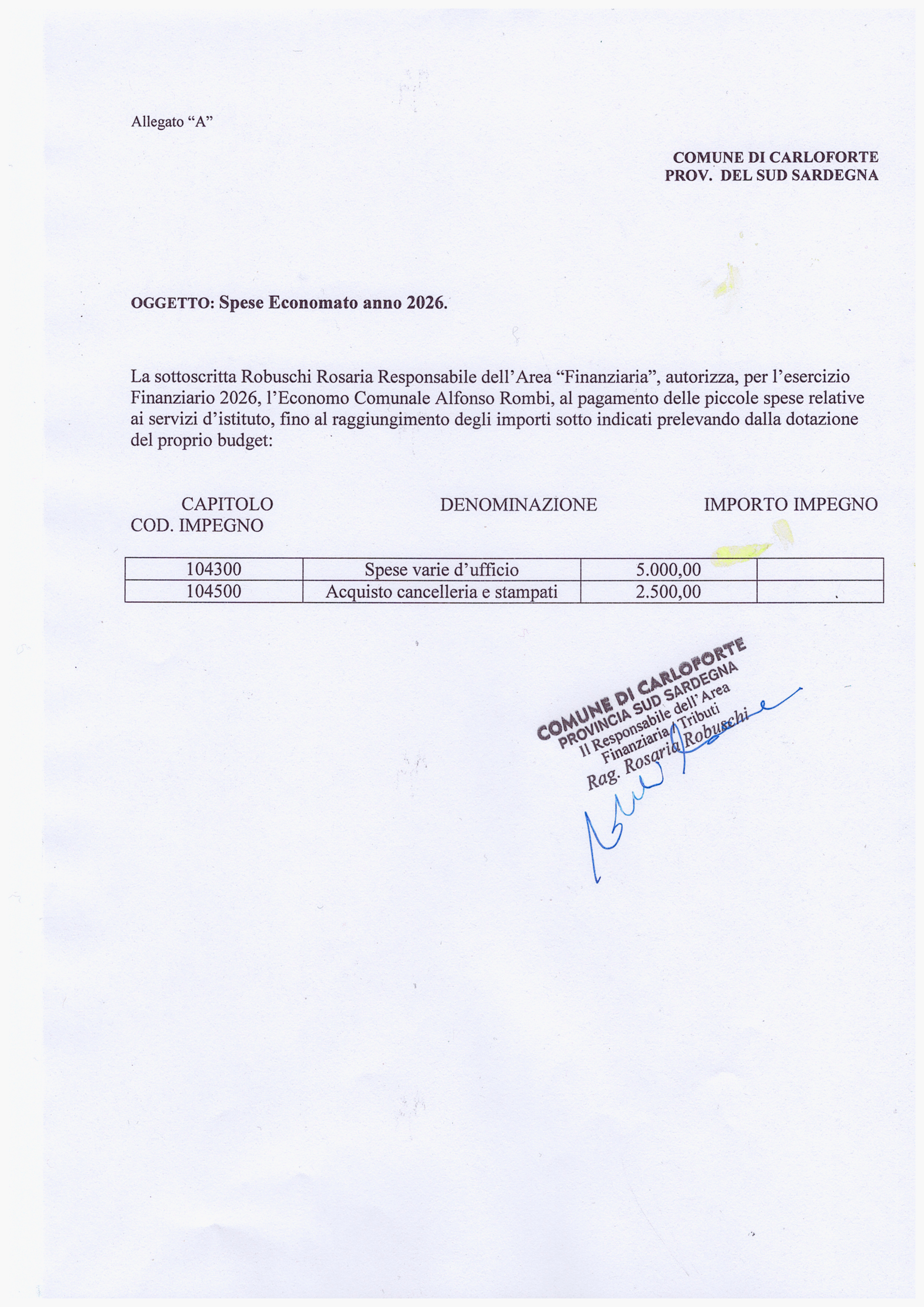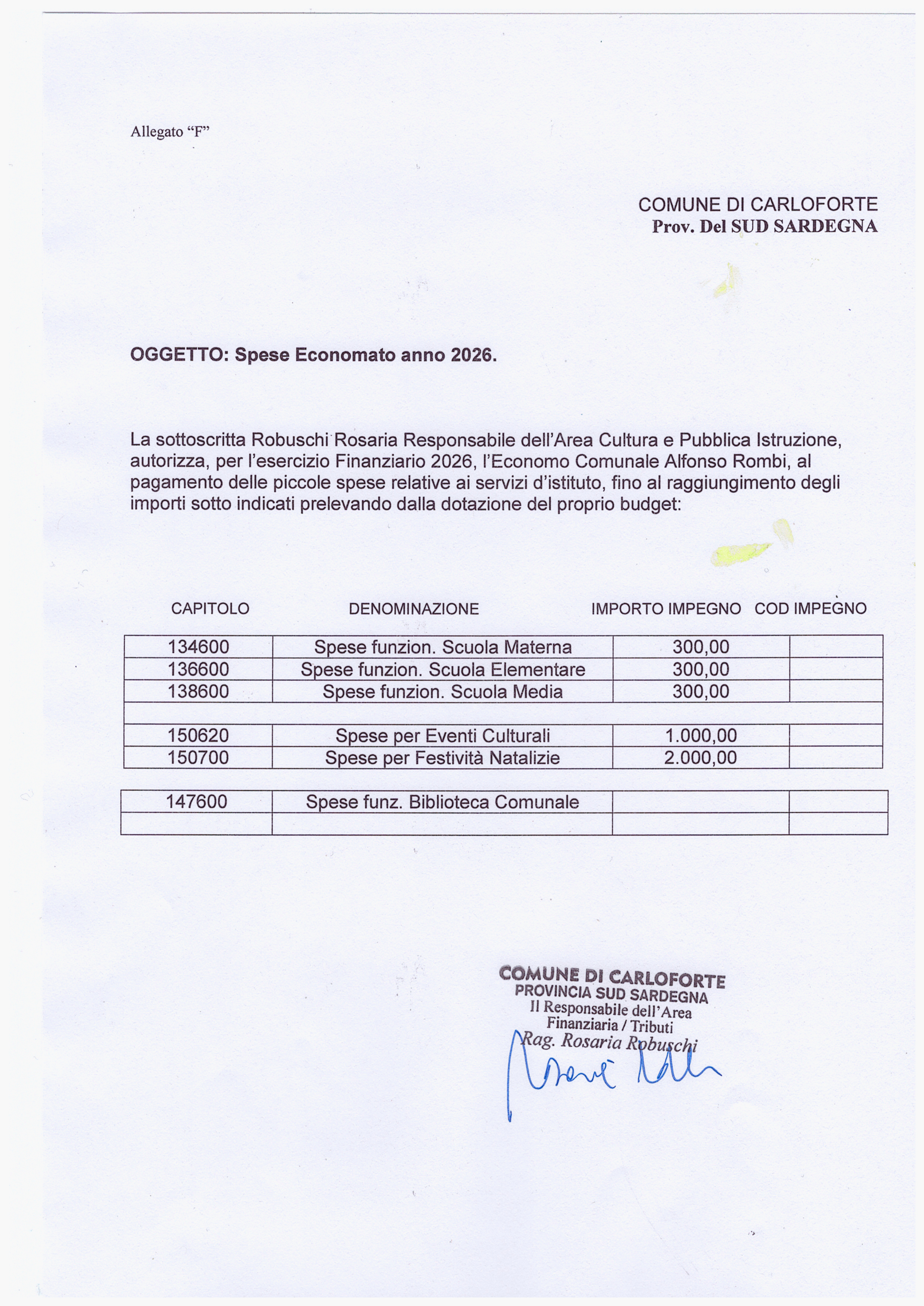 Oggetto: IMPEGNI SPESE ECONOMATO ANNO 2026